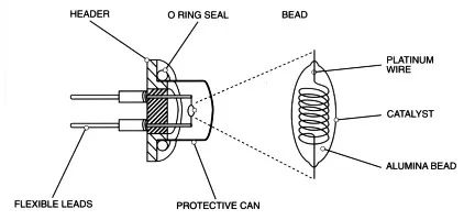 一般由線徑15um或20um或30um的高純度鉑線圈并在其外包裹載體催化劑形式球體,在一定的溫度條件下,當(dāng)可燃性氣體與上述球體接觸時(shí)會與其表面的吸附氧發(fā)生劇烈的無焰燃燒反應(yīng),反應(yīng)釋放的熱量導(dǎo)致鉑線圈溫度變化,溫度變化又導(dǎo)致鉑線圈電阻發(fā)生變化,測量電阻變化就可以測到氣體濃度。