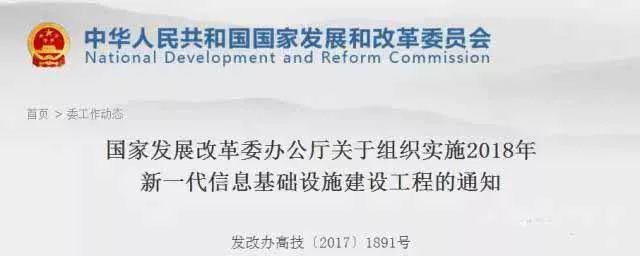 為了能在這場(chǎng)爭(zhēng)奪戰(zhàn)中走在前端,國(guó)家也在大力推動(dòng)產(chǎn)品成熟。昨日,國(guó)家發(fā)改委辦公廳發(fā)布了《關(guān)于組織實(shí)施2018年新一代信息基礎(chǔ)設(shè)施建設(shè)工程的通知》。