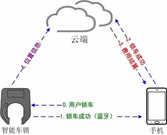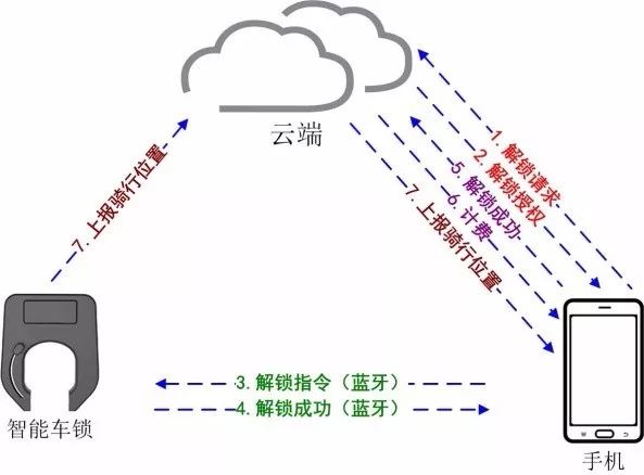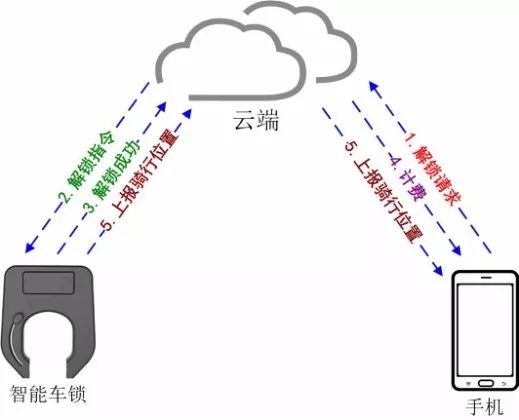 1. 手機先掃單車上二維碼,而后向云端發(fā)起解鎖請求(請求中會攜帶掃碼單車的ID信息及用戶個人賬號信息)。云端對用戶信息、單車信息進行核查,而后將授權(quán)信息發(fā)送給手機。(步驟1、2)