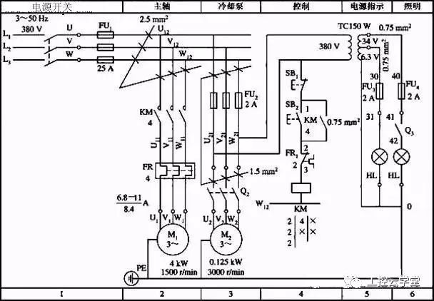 (3)從電源到電動(dòng)機(jī)的電路,通過的電流較大,稱為主電路,用粗線條繪制;輔助電路(包括控制電路、照明電路和信號(hào)電路)的電流小,用細(xì)線條繪制。