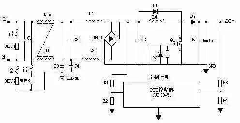 輸入電壓經(jīng)L1、L2、L3等組成的EMI濾波器,BRG1整流一路送PFC電感,另一路經(jīng)R1、R2分壓后送入PFC控制器作為輸入電壓的取樣,用以調(diào)整控制信號的占空比,即改變Q1的導(dǎo)通和關(guān)斷時(shí)間,穩(wěn)定PFC輸出電壓。L4是PFC電感,它在Q1導(dǎo)通時(shí)儲存能量,在Q1關(guān)斷時(shí)施放能量。D1是啟動二極管。D2是PFC整流二極管,C6、C7濾波。PFC電壓一路送后級電路,另一路經(jīng)R3、R4分壓后送入PFC控制器作為PFC輸出電壓的取樣,用以調(diào)整控制信號的占空比,穩(wěn)定PFC輸出電壓。