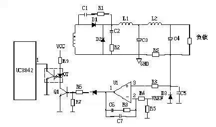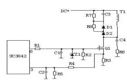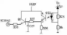 當(dāng)輸出電路短路或過流,變壓器原邊電流增大,R3兩端電壓降增大,③腳電壓升高,UC3842⑥腳輸出占空比逐漸增大,③腳電壓超過1V時(shí),UC3842關(guān)閉無輸出。