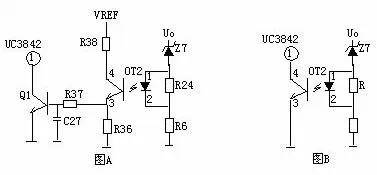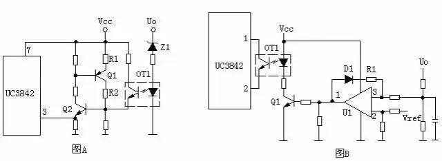 圖A的工作原理是,當(dāng)輸出電壓Uo升高,穩(wěn)壓管導(dǎo)通,光耦導(dǎo)通,Q2基極得電導(dǎo)通,由于Q2的導(dǎo)通Q1基極電壓降低也導(dǎo)通,Vcc電壓經(jīng)R1、Q1、R2使Q2始終導(dǎo)通,UC3842③腳始終是高電平而停止工作。在圖B中,UO升高U1③腳電壓升高,①腳輸出高電平,由于D1、R1的存在,U1①腳始終輸出高電平Q1始終導(dǎo)通,UC3842①腳始終是低電平而停止工作。正反饋?