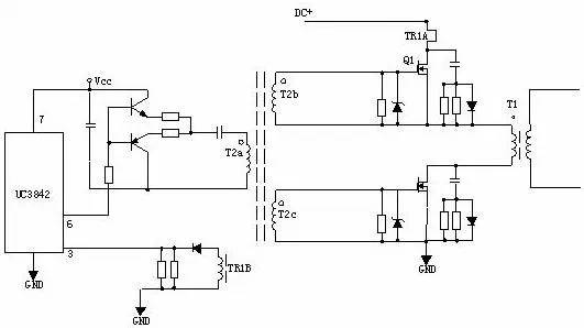 T2為驅(qū)動變壓器,T1為開關(guān)變壓器,TR1為電流環(huán)。