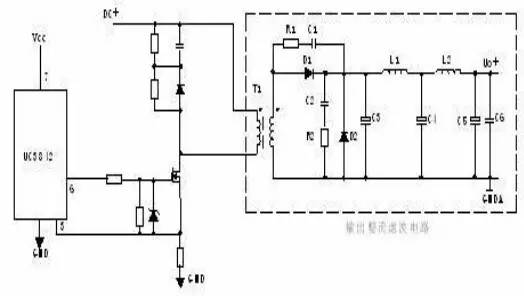 T1為開關(guān)變壓器,其初極和次極的相位同相。D1為整流二極管,D2為續(xù)流二極管,R1、C1、R2、C2為削尖峰電路。L1為續(xù)流電感,C4、L2、C5組成π型濾波器。