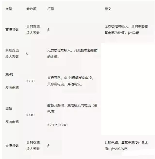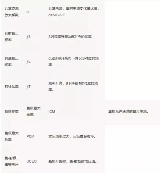 三極管性能參數(shù)較多,有直流、交流和極限參數(shù)之分: