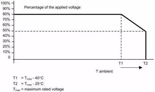 2,表面溫度<85℃,超過85℃耐壓按照下圖降額使用。此處的電壓指的是直流電壓疊加交流峰值電壓。