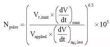5,薄膜電容的使用壽命取決于電壓值和電壓脈沖的上升速率。允許的脈沖數(shù)量和電壓值以及脈沖斜率的關(guān)系,如下式: