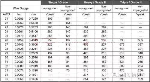 磁性元件中,線對線之間的最大電壓不能超過下表: