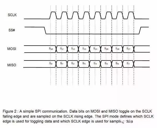 SPI有四種操作模式——模式0、模式1、模式2和模式3,它們的區(qū)別是定義了在時鐘脈沖的哪條邊沿轉(zhuǎn)換(toggles)輸出信號,哪條邊沿采樣輸入信號,還有時鐘脈沖的穩(wěn)定電平值(就是時鐘信號無效時是高還是低)。每種模式由一對參數(shù)刻畫,它們稱為時鐘極(clock polarity)CPOL與時鐘期(clock phase)CPHA。