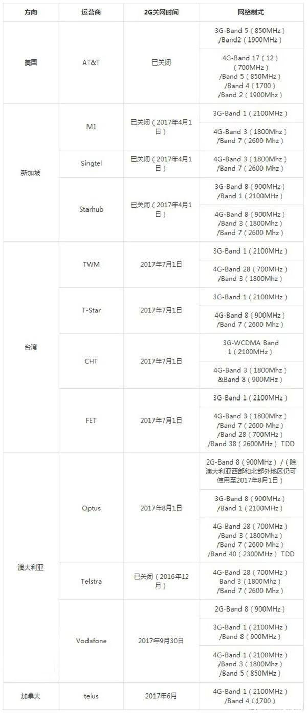通知表示,隨著移動通信技術不斷進步,手機3/4G網(wǎng)絡日漸成熟并得到廣泛應用,部分國家和地區(qū)已正式關閉2G網(wǎng)絡。截止2017年7月1日確認的已關閉或即將關閉2G網(wǎng)絡的漫游地合作運營商如下: