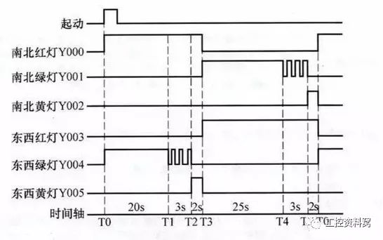 當(dāng)按下起動(dòng)按鈕后,南北紅燈亮25s,在南北紅燈亮25s的時(shí)間里,東西綠燈先亮20s再以1次/s的頻率閃爍3次,接著東西黃燈亮2s,25s后南北紅燈熄滅,熄滅時(shí)間維持30s,在這30s時(shí)間里,東西紅燈一直亮,南北綠燈先亮25s,然后以1次/s頻率閃爍3次,接著南北黃燈亮2s。以后重復(fù)該過程。按下停止按鈕后,所有的燈都熄滅。交通信號(hào)燈的工作時(shí)序如下圖所示。
