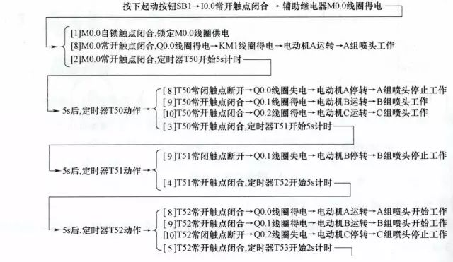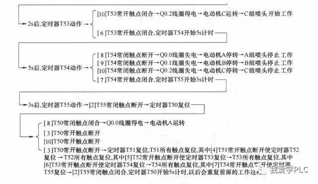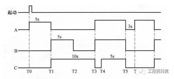 當(dāng)按下起動(dòng)按鈕后,A組噴頭先噴5s后停止,然后B、C組噴頭同時(shí)噴,5s后,B組噴頭停止、C組噴頭繼續(xù)噴5s再停止,而后A、B組噴頭噴7s,C組噴頭在這7s的前2s內(nèi)停止,后5s內(nèi)噴水,接著A、B、C三組噴頭同時(shí)停止3s,以后重復(fù)前述過程。按下停止按鈕后,三組噴頭同時(shí)停止噴水。下圖為A、B、C三組噴頭工作時(shí)序圖。