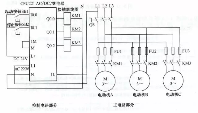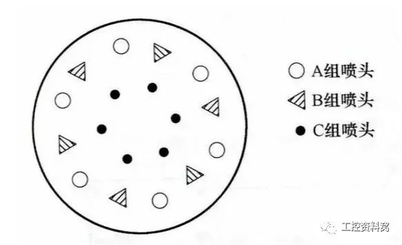 系統(tǒng)要求用兩個(gè)按鈕來控制A、B、C三組噴頭工作(通過控制三組噴頭的泵電動(dòng)機(jī)來實(shí)現(xiàn)),三組噴頭排列如下圖所示。