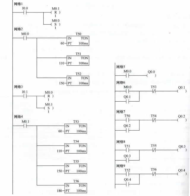 在上圖所示的梯形圖中,采用了一個(gè)特殊的輔助繼電器SM0.5,稱為觸點(diǎn)利用型特殊繼電器,它利用PLC自動(dòng)驅(qū)動(dòng)線圈,用戶只能利用它的觸點(diǎn),即畫梯形圖里只能畫它的觸點(diǎn)。SM0.5能產(chǎn)生周期為1s的時(shí)鐘脈沖,其高低電平持續(xù)時(shí)間各為0.5s,以上圖梯形圖網(wǎng)絡(luò)9為例,當(dāng)T50常開觸點(diǎn)閉合,在1s內(nèi),SM0.5常閉觸點(diǎn)接通、斷開時(shí)間分別為0.5s,Q0.4線圈得電、失電時(shí)間也都為0.5s。