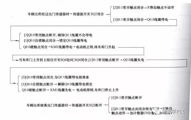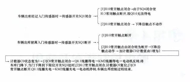 在車輛出庫經(jīng)過出門傳感器時(shí),出門傳感器開關(guān)閉合,車庫門電動(dòng)機(jī)正轉(zhuǎn),車庫門上升,當(dāng)門上升到上限位開關(guān)處時(shí),電動(dòng)機(jī)停轉(zhuǎn);車輛出庫經(jīng)過入門傳感器時(shí),入門傳感器開關(guān)閉合,車庫門電動(dòng)機(jī)反轉(zhuǎn),車庫門下降,當(dāng)門下降到下限位開關(guān)處時(shí),電動(dòng)機(jī)停轉(zhuǎn)。