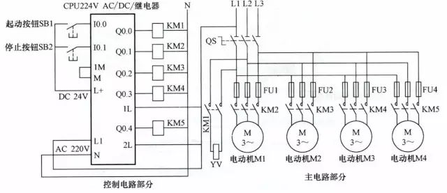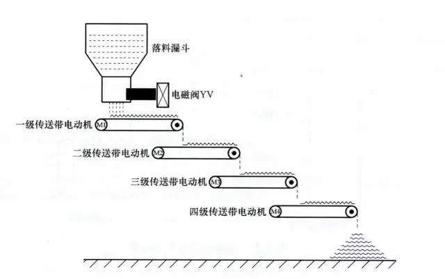 當(dāng)按下起動(dòng)按鈕后,電磁閥YV打開,開始落料,同時(shí)一級(jí)傳送帶電動(dòng)機(jī)M1起動(dòng),將物料往前傳送,6s后二級(jí)傳送帶電動(dòng)機(jī)M2起動(dòng),M2起動(dòng)5s后三極傳送帶電動(dòng)機(jī)M3起動(dòng),M3起動(dòng)后4s后四級(jí)傳送帶電動(dòng)機(jī)M4起動(dòng)。