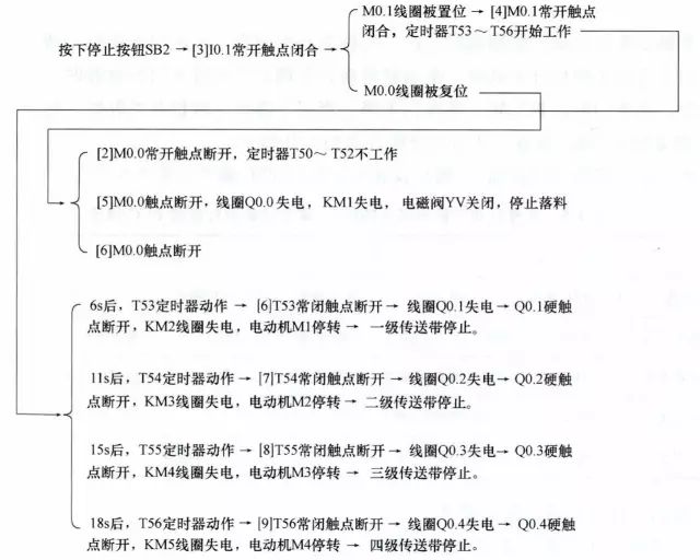 當(dāng)按下停止按鈕后,為了不讓各傳送帶上有物料堆積,要求先關(guān)閉電磁閥YV,6s后讓M1停轉(zhuǎn),M1停轉(zhuǎn)5s后讓M2停轉(zhuǎn),M2停轉(zhuǎn)4s后讓M3停轉(zhuǎn),M3停轉(zhuǎn)3s后讓M4停轉(zhuǎn)。