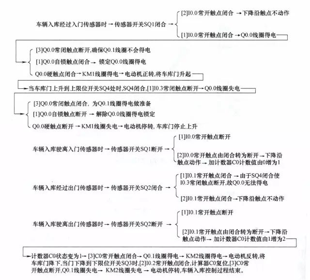 在車輛入庫經(jīng)過入門傳感器時(shí),入門傳感器開關(guān)閉合,車庫門電動(dòng)機(jī)正轉(zhuǎn),車庫門上升,當(dāng)車庫門上升到上限位開關(guān)處時(shí),電動(dòng)機(jī)停轉(zhuǎn);車輛進(jìn)庫經(jīng)過出門傳感器時(shí),出門傳感器開關(guān)閉合,車庫門電動(dòng)機(jī)反轉(zhuǎn),車庫門下降,當(dāng)車庫門下降到下限位開關(guān)處時(shí),電動(dòng)機(jī)停轉(zhuǎn)。