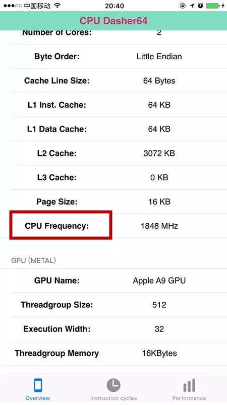 之后打開 App ,下滑后找到CPU Frequency這一項,查看一下你的 iPhone 6S 的CPU 頻率。(在不開啟低電量模式的情況下進行測試)如果你的 iPhone 6S低于出廠值 1848Mhz比較明顯的情況下,那就說明你的 6S 的 iOS 系統(tǒng)需要降低 CPU 頻率來換取電池續(xù)航時間。