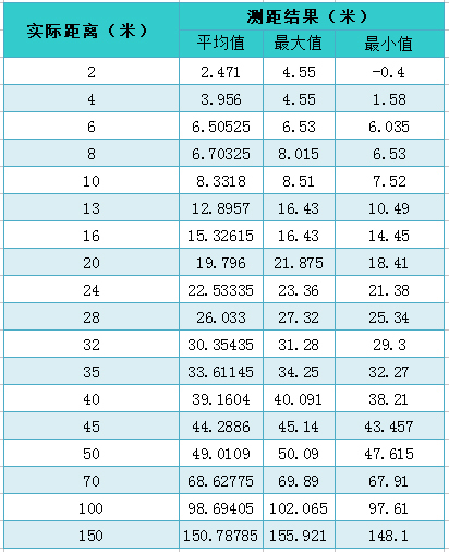 測試配置:SF=10 BW=1.6MHz,測距10次,分別記錄平均值、最大值、最小值。