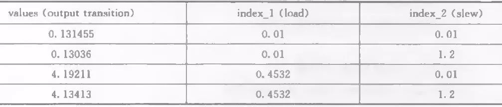 values與index可以表達(dá)為value=f(index_1,index_2)。當(dāng)輸出端線負(fù)載為0. 01,輸入斜率為0. 01時(shí),輸出上升時(shí)間為0.131455。當(dāng)輸出線負(fù)載為0.01,輸人斜率為1 .2時(shí),輸出上升時(shí)間為0.13036。同理,當(dāng)輸出端線負(fù)載為0.4532,輸入斜率分別為0.01和1.2 時(shí),對(duì)應(yīng)另外兩個(gè)上升時(shí)間。如下圖所示:
