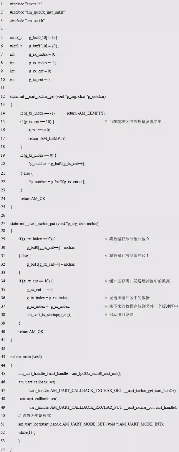該程序的功能是將每次收到的10 個(gè)數(shù)據(jù)原封不動(dòng)地發(fā)送出去,am_main()函數(shù)中的主循環(huán)可以不參與任何處理,即可實(shí)現(xiàn)串口數(shù)據(jù)的收發(fā)。