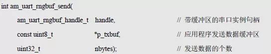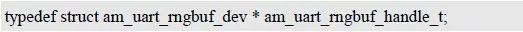 函數(shù)的返回值為帶緩沖區(qū)串口的實(shí)例句柄,可用作其它通用接口函數(shù)中handle 參數(shù)的實(shí)參。其類型am_uart_rngbuf_handle_t(am_uart_rngbuf.h)定義如下: