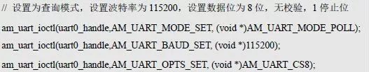 為了便于傳遞不同類型的值,通常將p_arg 設(shè)置為void *類型。比如,在設(shè)置波特率時(shí),其類型為uint32_t;而在獲取波特率時(shí),其類型為 uint32_t *。如果返回AM_OK,說明本次控制命令執(zhí)行成功;如果返回-AM_EINVAL,說明因參數(shù)無效導(dǎo)致控制命令執(zhí)行失敗。比如,設(shè)置UART 為查詢模式,波特率為115200,8 位數(shù)據(jù)位,無校驗(yàn),1 位停止位,使用范例詳見程序清單5.101。