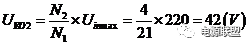 續(xù)流二極管VD2上的反向電壓UVD2與輸出變壓器次級電壓的最大值是相同的。根據(jù)單端正激式變換器公式得: