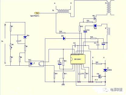 過電壓保護(hù)電路由光電耦合器PC1、R16組成的。當(dāng)輸出電壓超過15V時,光電耦合器PC1動作,經(jīng)過引腳2接入反饋電壓電路,使輸出級鎖定為低電平。