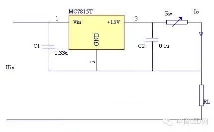 式中Iq為MC7815的靜電流,小于10mA。當(dāng)RW較小即輸出電流較大時,可以忽略Iq。當(dāng)電路中電壓或者是負(fù)載發(fā)生變化時,MC7815用改變自身壓差來維持通過負(fù)載的電流不變的。
