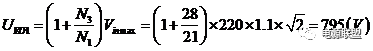根據(jù)單端正激式變換器計開關(guān)管VT1承受最大電壓公式得: