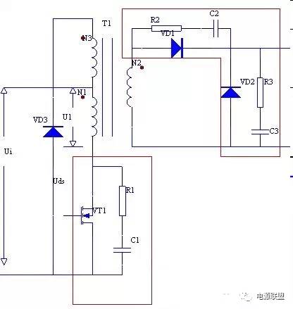 在開關(guān)電源中,由于變壓器的漏感、布線的引線電感存在、開關(guān)管在關(guān)斷瞬間會產(chǎn)生很高的電壓尖峰脈沖。整流快速恢復(fù)二極管由于存在存儲效應(yīng),反向恢復(fù)過程中也會出現(xiàn)很高的反向恢復(fù)的碾壓尖峰脈沖。這些過電壓尖峰脈沖的出現(xiàn)不但危及功率器件的工作安全性,而且形成很強(qiáng)的電磁干擾噪聲。為此必須在功率器件兩端設(shè)計尖峰電壓緩沖吸收電路。緩沖電路圖如圖中紅框部分: