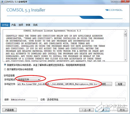 3、允許用戶協(xié)議,將許可證格式修改為“許可證文件”,然后點(diǎn)擊瀏覽載入安裝包中“_SolidSQUAD_”目錄下的“LMCOMSOL_Multiphysics_SSQ.lic”
