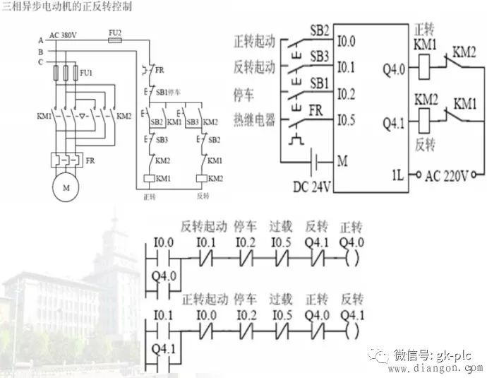 電氣原理圖轉(zhuǎn)化為梯形圖的過程中,真正實現(xiàn)了一一對應(yīng)的關(guān)系,I0.0代表輸入,所接的就是電氣原理圖里面的啟動開關(guān),停車開關(guān),熱保護(hù)繼電器,Q4.0代表輸出,所接的是控制電機(jī)正反轉(zhuǎn)的交流接觸器(CJ),其實在轉(zhuǎn)化完之后的電路中,真實的電機(jī)只連接了熱保護(hù)繼電器和交流接觸器,需要人操作的按鈕全都接到了plc的輸入端。