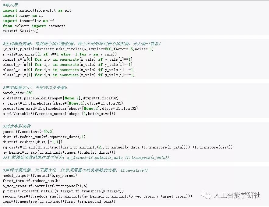 對(duì)于線性數(shù)據(jù)集的分類(lèi)來(lái)說(shuō),我們當(dāng)然會(huì)選擇線性核函數(shù)。但如果要分割非線性數(shù)據(jù)集,我們?cè)撊绾巫瞿??答案是,我們可以改變損失函數(shù)中的核函數(shù)。我們今天就以高斯核函數(shù)來(lái)進(jìn)行案例說(shuō)明: