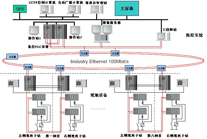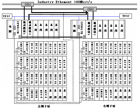 每個集控控制站由4個電源模塊、2個中央處理器(CPU-417H)、4個通信模塊(CP443-1)、2個ET200遠(yuǎn)程站、8個數(shù)字量輸入模塊(DI)、6個數(shù)字量輸出模塊(DO)、2個操作員面板PC670等組成。每個現(xiàn)地控制子站由1個電源模塊、1個中央處理器(CPU-417H)、2個通信模塊(CP443-1)、4個ET200遠(yuǎn)程站、2個模擬量輸入模塊(AI)、2個模擬量輸出模塊(AO)、15個數(shù)字量輸入模塊(DI)、8個數(shù)字量輸出模塊(DO)、2個SM338模塊、操作員面板TP37等組成。