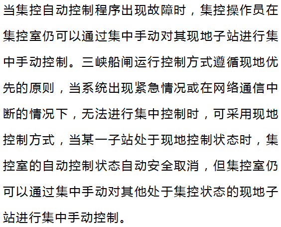 每個子站作為一線船閘整體運(yùn)行自動監(jiān)控系統(tǒng)的一個基本控制單元,除具有現(xiàn)地操作控制的基本功能外,還應(yīng)能接受集控站的程序控制指令,自動地對人字工作閘門、輸水廊道工作閥門、防撞警戒裝置、通航指揮信號裝置等現(xiàn)地設(shè)備進(jìn)行操作和控制;采集液壓站系統(tǒng)信息、現(xiàn)場閘閥門開度、位置信息、水位檢測數(shù)據(jù)以及相鄰閘首保證安全運(yùn)行的閉鎖信息,經(jīng)預(yù)處理后輸出操作執(zhí)行指令。并向集控站反送現(xiàn)場信息,集控站依據(jù)這些信息,作出控制決策,自動完成船閘整體運(yùn)行的監(jiān)控任務(wù),使船只(隊)高效、安全順利通過。