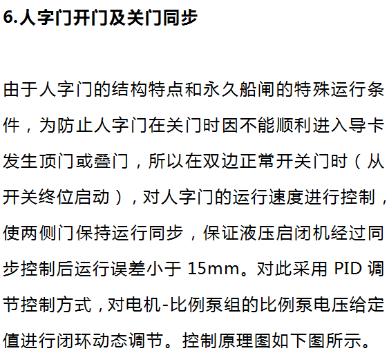 程序運(yùn)行時,對兩側(cè)人字門開度差進(jìn)行檢測,根據(jù)開度差,經(jīng)PID運(yùn)算后給定比例泵電壓調(diào)整值,改變?nèi)俗珠T運(yùn)行速度。同時限定調(diào)整值的變化范圍和幅度,防止人字門運(yùn)行過快和抖動。當(dāng)人字門開度差超過設(shè)定范圍20mm時A類報警。