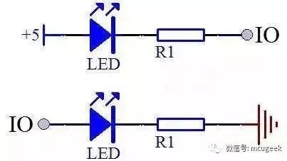 圖 3-9 中上邊的 LED 燈,和我們第二課講過的 LED 燈是一樣的,當 IO 口是高電平時,小燈熄滅,當 IO 口是低電平時,小燈點亮。那么下邊的電路呢,按照這種推理,IO 口是高電平的時候,應該有電流流過并且點亮小燈,但實際上卻并非這么簡單。