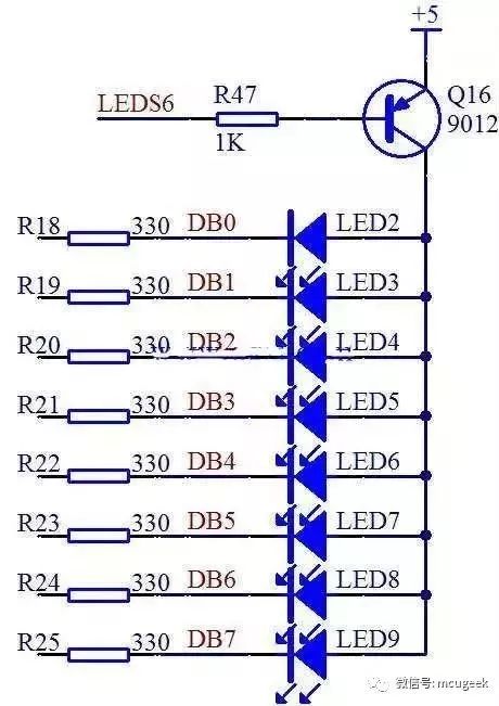 這里我們要學會看電路圖的一個知識點,電路圖右側(cè)所有的 LED 下側(cè)的線最終都連到一根黑色的粗線上去了,大家注意,這個地方不是實際的完全連到一起,而是一種總線的畫法,畫了這種線以后,表示這是個總線結(jié)構(gòu)。而所有的名字一樣的節(jié)點是一一對應的連接到一起,其他名字不一樣的,是不連在一起的。比如左側(cè)的 DB0 和右側(cè)的最右邊的 LED2 小燈下邊的DB0 是連在一起的,而和 DB1 等其他線不是連在一起的。