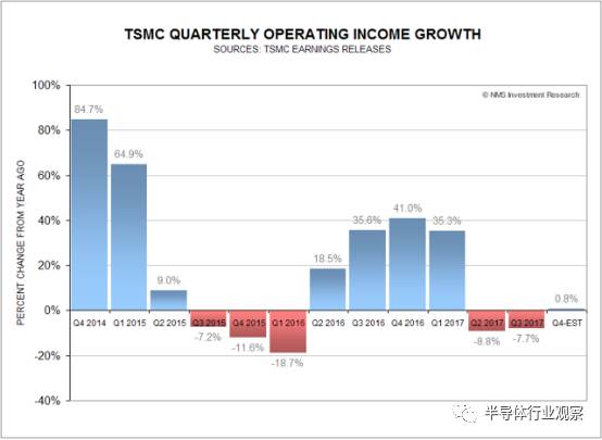 自2016年第四季度以來,臺(tái)積電的營(yíng)收增長(zhǎng)一直在下滑。根據(jù)該公司今年10月的財(cái)務(wù)報(bào)告,在2017年第四季度,該公司的營(yíng)收介于2760億和2790億新臺(tái)幣之間,預(yù)期營(yíng)收將同比增長(zhǎng)6%左右。他們的2017年全年?duì)I收將達(dá)到9770億新臺(tái)幣,同比增長(zhǎng)3%,遠(yuǎn)低于IC Insights和Gartner的7%和8.3%的增長(zhǎng)預(yù)測(cè)。疲軟的營(yíng)收增長(zhǎng)可能是美元走弱和激進(jìn)定價(jià)結(jié)合的結(jié)果。如果平均利潤(rùn)率為40%,該公司在2017年第四季度的營(yíng)業(yè)利潤(rùn)可能會(huì)達(dá)到1110億新臺(tái)幣,比去年同期增長(zhǎng)0.8%。