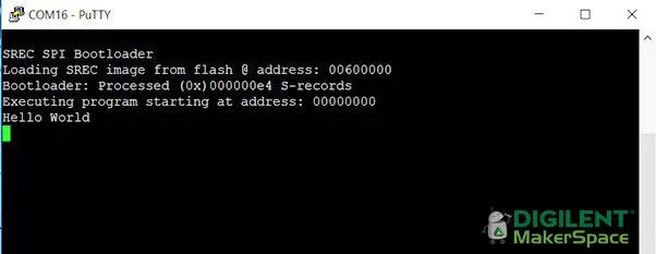 一旦這個(gè)文件構(gòu)建完成并燒寫(xiě)到QSPI存儲(chǔ)中,我們就可以進(jìn)行測(cè)試查看MCS文件的工作情況。將Arty板卡與PC終端建立連接然后按下板卡上的復(fù)位(reset)按鈕。幾秒鐘后你就會(huì)看到Arty板卡上的“done”LED燈亮起,然后在終端窗口中看到SREC bootloader的執(zhí)行結(jié)果。報(bào)告應(yīng)該顯示S-record文件在程序執(zhí)行前已經(jīng)從QSPI加載到DDR SDRAM中了。