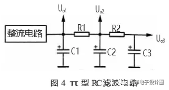 圖 4 所示是 π 型 RC 濾波電路。電路中的 C1、C2 和 C3 是 3 只濾波電容,R1 和 R2 是濾波電阻,C1、R1 和C2 構(gòu)成第一節(jié) π 型的 RC 濾波電路, C2、 R2 和 C3 構(gòu)成 第二節(jié) π 型 RC 濾波電路。由于這種濾波電路的形式 如同希臘字母 π 和采用了電阻器、電容器,所以稱為 π 型 RC 濾波電路。