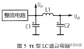 在圖 5 的電路中,整流電路輸出的單向脈動(dòng)性直 流電壓先經(jīng)電容 C1 濾波,去掉大部分交流成分,然后 再加到 L1 和 C2 濾波電路中。