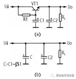 ①電路中的 VT1、 R1、 C1 組成電 子濾波器電路,這 一電路相當(dāng)于一 只容量為 C1×β1 大小電容器,β1 為 VT1 的電流放 大倍數(shù),而晶體管 的電流放大倍數(shù) 比較大,所以等效 電容量很大,可見(jiàn) 電子濾波器的濾 波性能是很好的。等效電路如圖 6(b)所示。圖中 C 為 等效電容。