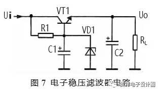 圖 7 所示是另一種電子穩(wěn)壓濾波器,與前一種電 路相比,在 VT1 基極與地端之間接入了穩(wěn)壓二極管 VD1。電子穩(wěn)壓原理如下: