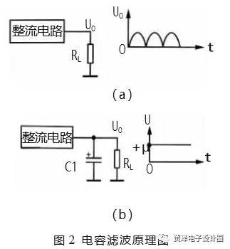 根據(jù)以上的分析,由于單向脈動(dòng)性直流電壓可分 解成交流和直流兩部分。在電源電路的濾波電路中,利 用電容器的“隔直通交”的特性和儲(chǔ)能特性,或者利用 電感“隔交通直”的特性可以濾除電壓中的交流成分。 圖 2 所示是電容濾波原理圖。