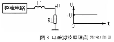 圖 3 所示是電感濾波原理圖。由于電感 L1 對(duì)直流 電相當(dāng)于通路,這樣整流電路輸出的直流電壓直接加 到負(fù)載 RL 上。